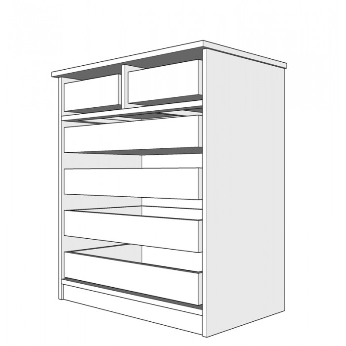 с четири големи и две малки чекмеджета със стандартни водачи, дървени дръжки и дъна от фазер